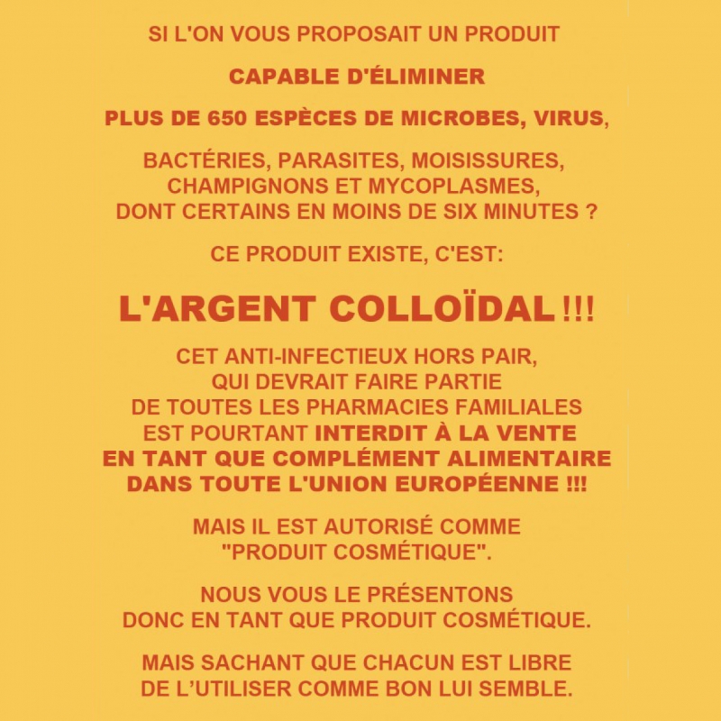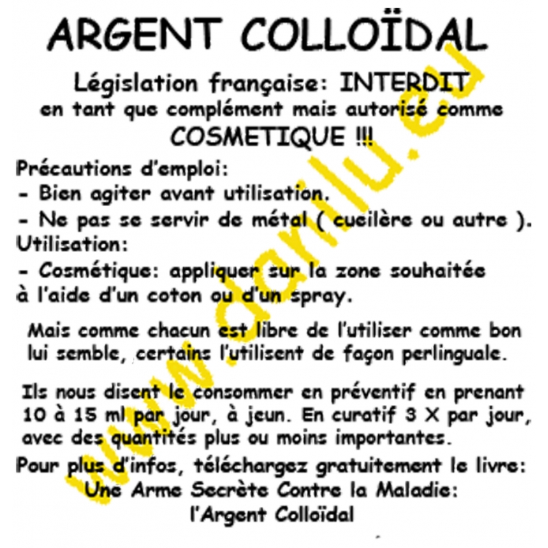 Mais, suite à l'interdiction de la vente d'argent colloïdal comme complément alimentaire, vous devrez l'acheter au « rayon cosmétique » ou encore vous fournir à l'étranger, ou bien sur internet (comme ici).